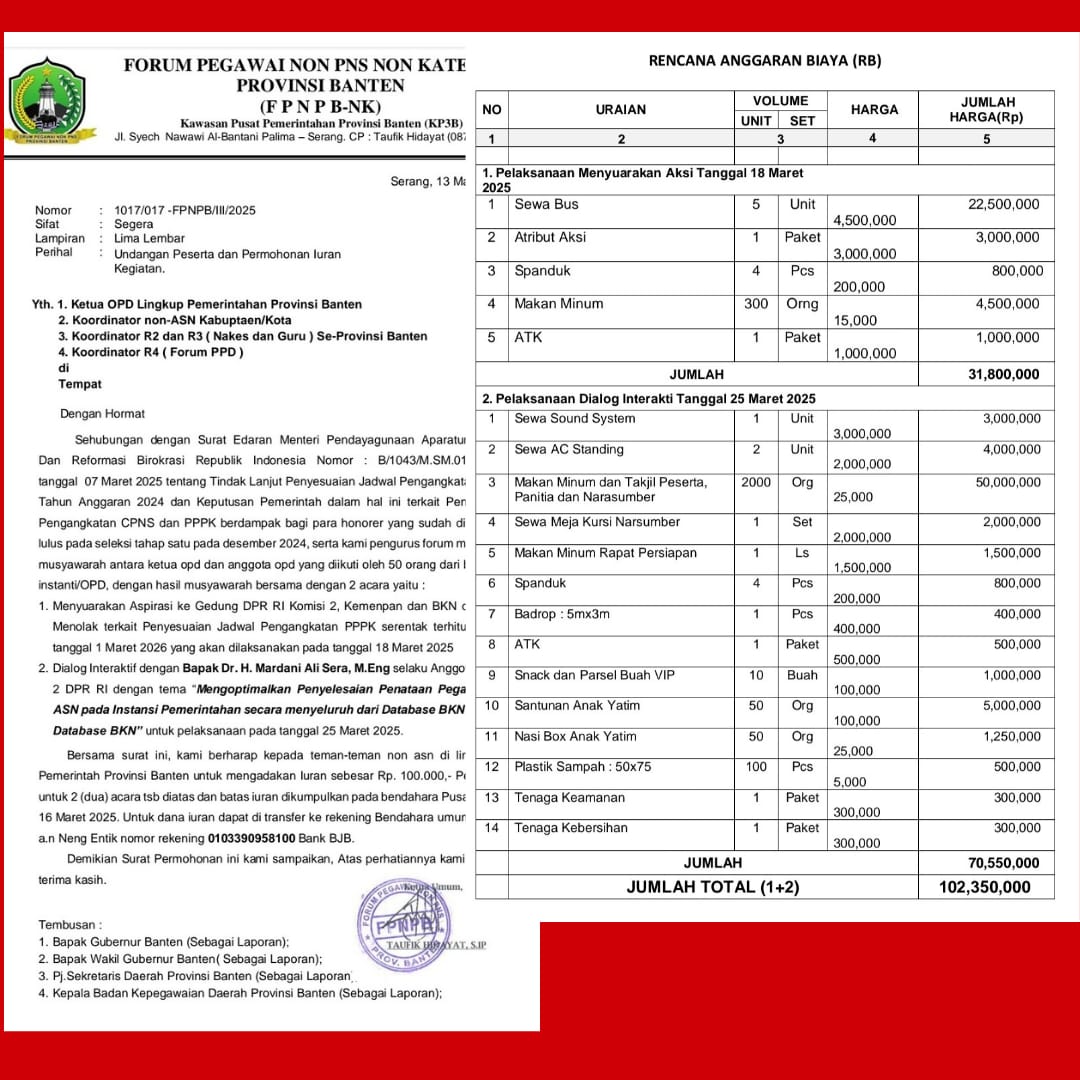 Dikonfirmasi oleh media, Taufik Hidayat Ketua Forum Pegawai Non PNS Non Kategori Provinsi Banten membenarkan meminta iuran dengan uang yang ditulis di pada surat nomor 1017/017-FPNPB/III/2025 dengan jumlah Rp. 102.350.000.
