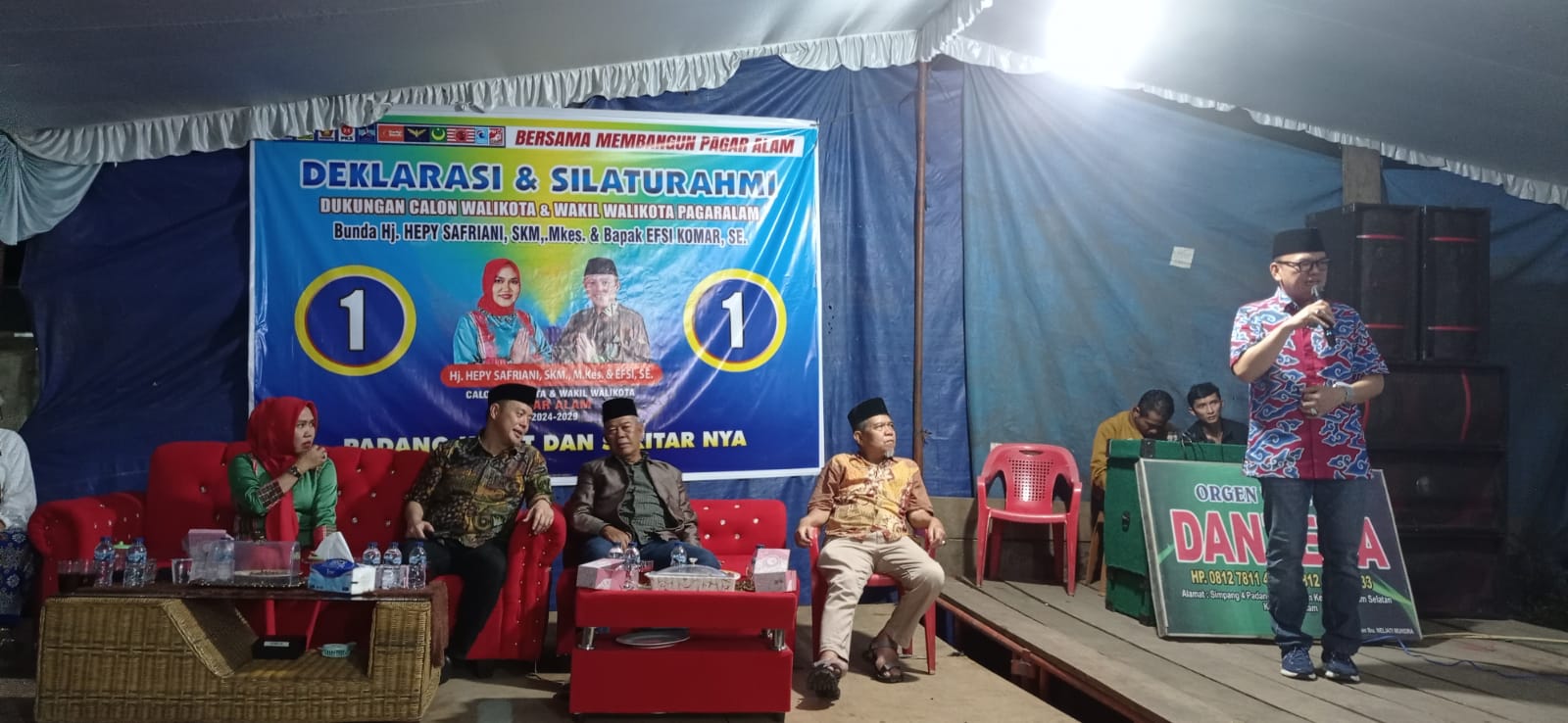 Pagar Alam – Ketua Tim pemenangan dan Relawan Hepy-Efsi H.Joncik Muhammad,SS.i, SH,MM,MH menegaskan jika Hepy Safriani dan Efsi Komar menjadi Walikota Dan Wakil Walikota Pagar Alam Periode 2024-2029 dirinya berjanji akan membantu memajukan Kota Pagar Alam baik di bidang Pembangunan, Kesehatan, Pertanian, Pendidikan serta program lainnya.