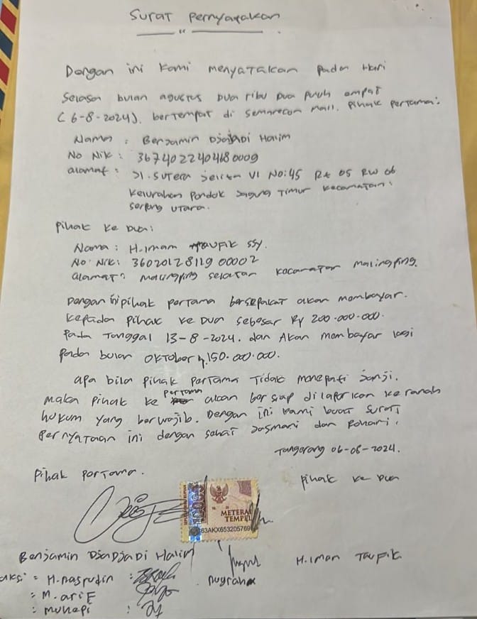 “Saya sudah bertemu dengan pihak kontraktor yaitu Pak Benzamin, pada Bulan Agustus 2024 di Tangerang. Dan Pak Benzamin membuat surat perjanjian akan melunasi sisa utang material ke saya sebesar Rp 150.000.000,- pada Bulan Oktober 2024, namun janjinya tidak ditepati,” ujarnya, Sabtu (7/12/2024) pagi.