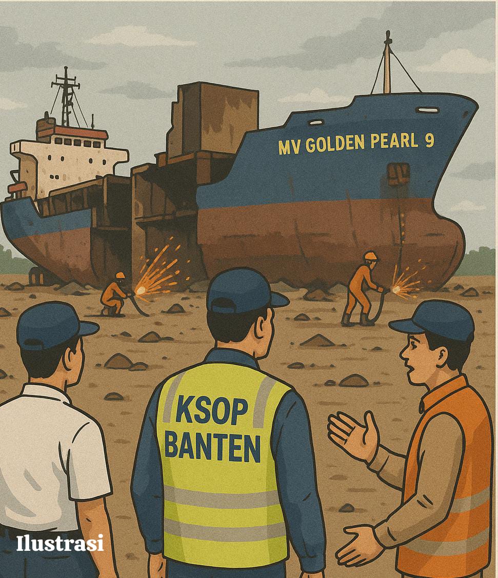 Serang – Anggota Kantor Kesyahbandaran dan Otoritas Pelabuhan (KSOP) Kelas I Banten, pada Senin (28/7/2025) siang, terpantau mendatangi lahan perusahaan Karya Putra Berkah (KPB) yang diketahui sedang melakukan aktivitas Pemotongan Kapal MV Golden Pearl 9.