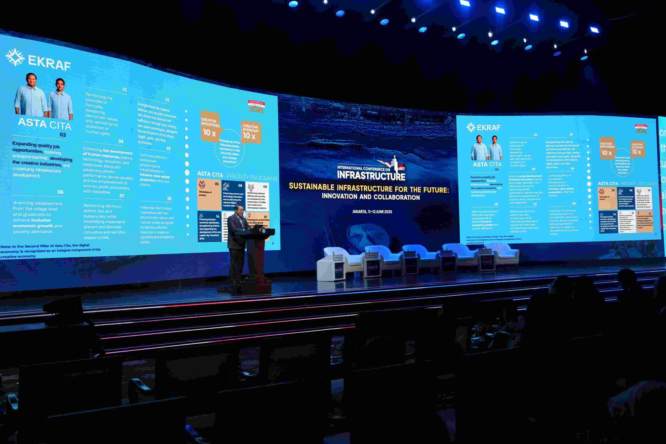 Jakarta,– Menteri Ekonomi Kreatif (Ekraf), Teuku Riefky Harsya, memaparkan tentang strategi, capaian, dan target Kementerian Ekraf untuk lima tahun ke depan saat menjadi pembicara utama sesi tematik International Conference on Infrastructure (ICI) di Plennary Hall JICC, Kamis, 12 Juni 2025. Ketiga aspek itu nantinya akan meningkatkan infrastruktur ekraf, transformasi akses pendidikan, dan perluasan lapangan kerja yang berkualitas.