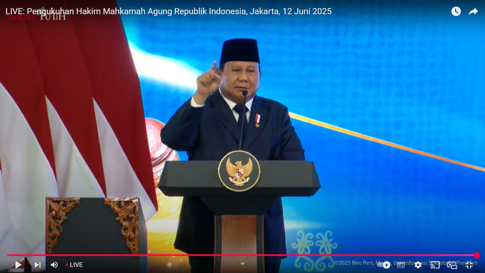 Jakarta,- Presiden Prabowo Subianto mengungkapkan rasa bangga untuk hadir disetiap momen yang diselenggarakan oleh Institusi Kekuasaan Kehakiman seperti Mahkamah Agung. Dalam kurun waktu 6 bulan sudah 2 kali diundang oleh MA, Kamis 12 Jun 2025