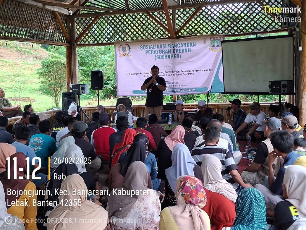 Banjarsari,- Dewan Perwakilan Rakyat Daerah (DPRD) Provinsi Banten menggelar sosialisasi Rancangan Peraturan Daerah (Raperda) tentang Pemberdayaan, Penataan, Pengembangan dan Perlindungan Ekonomi Kreatif, Koperasi, dan Usaha Mikro, Kecil, dan Menengah (UMKM) di Saung Jawara, Kecamatan Banjarsari, Lebak Banten, pada hari Rabu. 26/02/2025