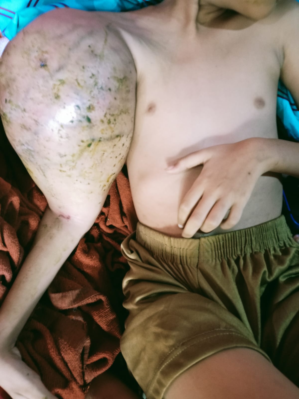 “Semenjak timbul benjolan anak tersebut sudah tidak bersekolah dan tidak bisa bermain kembali, berat benjolan tersebut 2 kilo, keterangan dari rumah sakit katanya kena kanker ganas, dari sekolah 6 bulan lalu baru datang ke rumah dan menyerahkan uang sebesar 6 juta untuk membantu biaya rumah sakit.