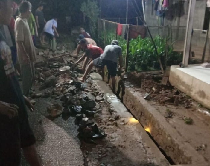 “Pada malam ini kami warga masyarakat Kampung Cimanyangray gotong royong membersihkan dan memperbaiki drainase yang jebol terutama di depan masjid air meluap,” ujarnya.